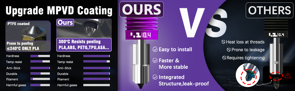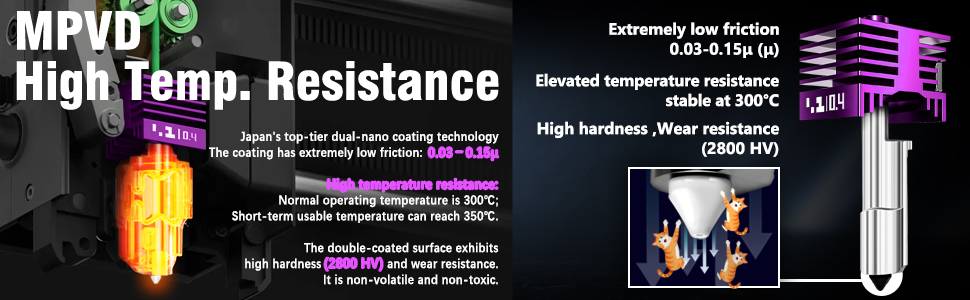 【Advanced MPVD Low Friction Coating】Upgraded MPVD coating creates a smooth, low-adhesion surface that prevents filament buildup, nozzle clogging, and material sticking. Keeps the 0.4mm hotend clean and improves extrusion consistency compared to standard hardened steel or uncoated nozzles
