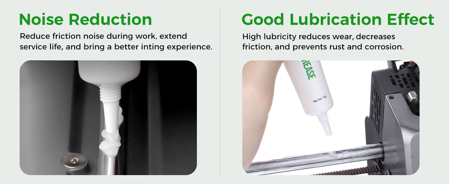 Noise Reduction and Anti-Wear: This lubrication grease is designed to reduce noise and minimize friction-related wear, effectively protecting your machine from dust and rust. By using this grease, you can extend the lifespan of your 3D printer and maintain its smooth operation