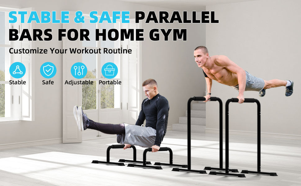 【Stable and Durable】This dip bar set is made of alloy steel for long-lasting useand can support up to 880 lbs. lts ultra-stable structure eliminates anyshaking or tipping during intense workouts.
