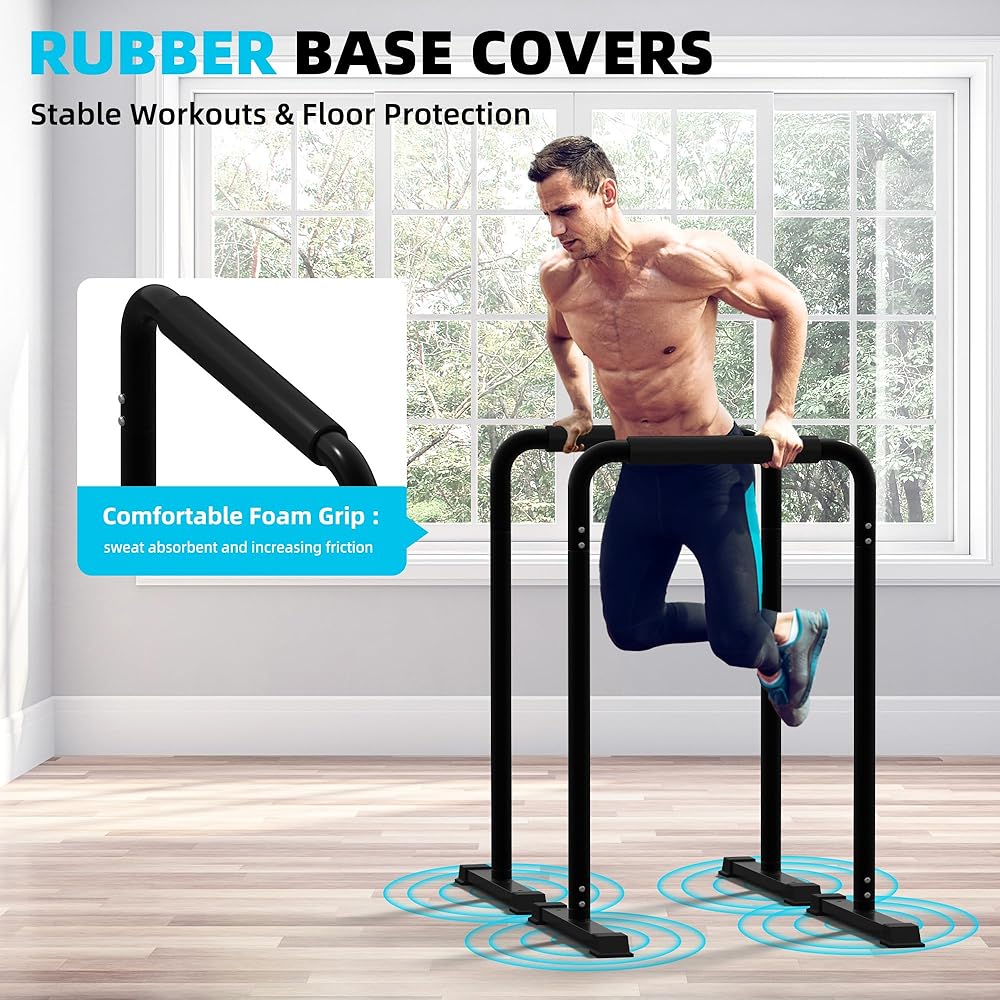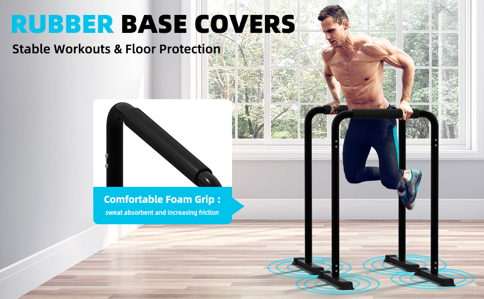 【Soft Handles and Non-Slip Feet】The dip bars feature high-quality.comfortable foam handles that effectively prevent palm discomfort duringworkouts. The high-density material is sweat-resistant and slip-resistant. Thepush-up bar base is equipped with premium rubber feet, providing excellentanti-slip stability and maximizing safety, allowing you to confidentlychallenge your limits during training.