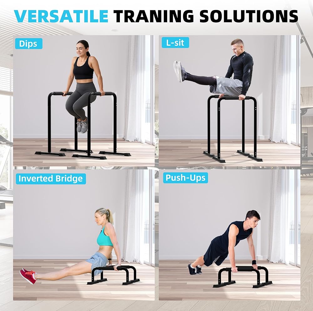 【Adjustable Height Design】The dip bars feature an adjustable height rangefrom 35.5 inches (90 cm) down to 11.8 inches (29 cm), making themexceptionally suitable for push-up training. Whether you are performing dips.straight-arm supports, inverted rows, push-ups, handstands, or knee planksupports, these parallel bars are an ideal choice for working out your upperbody and core muscles.