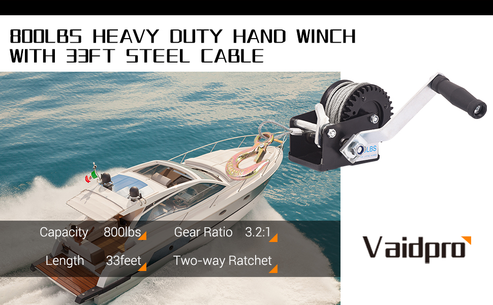 【Premium Material】Heavy duty hand winch, polyester strap diameter 5cm, 33ft(10m) length. Boat trailer winch constructed from premium steel, galvanized finish, can effectively prevent corrosion and rust resistance. The high-strength polyester belt effectively prevents the strap from becoming brittle under UV and direct sunlight.