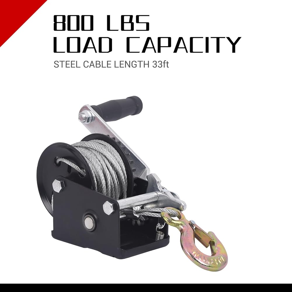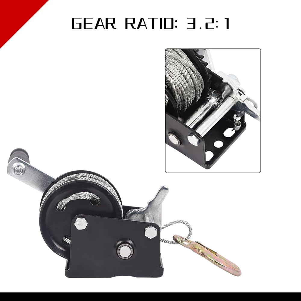 【Load Capacity】Our hand crank winch can support up to 3500lbs, gear ratio is 4:1 (primary speed ratio)/8:1 (secondary speed ratio), which reduces the required labor output and increases traction, enabling effortless lifting and improved efficiency.