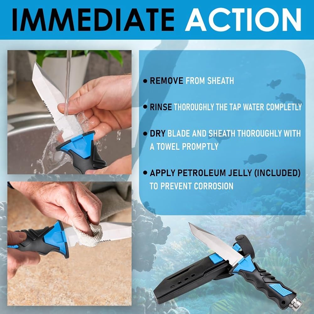 For best performance, regular maintenance is recommended—rinse with fresh water, dry after use, and apply oil to maintain blade condition. This helps preserve your divers knife with sheath for long-term use in saltwater environments.
