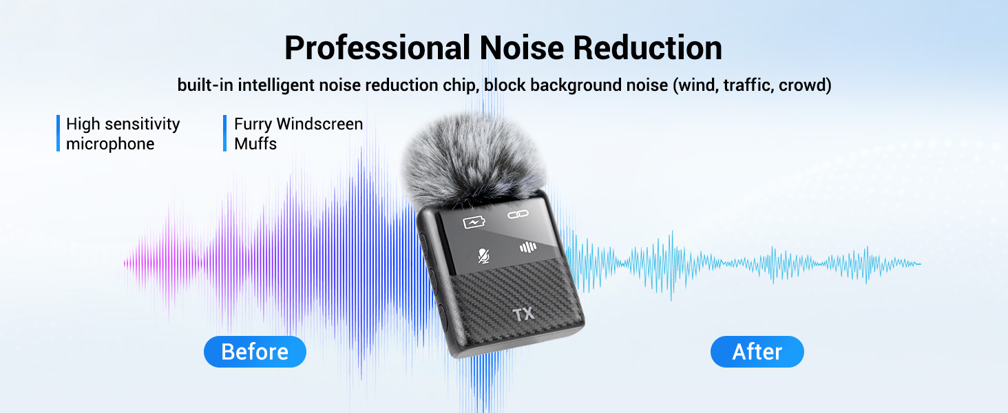 Professional Noise Reduction: Mini Lapel microphone wireless built-in intelligent noise reduction chip, recognizes and reduces environmental noise, this wireless lapel mic captures sound and video in real-time synchronization. It easily handles various noisy environments and restores clear and natural human voices. The clip on microphone wireless is equipped with 2 furry outdoor microphone windscreen muffs, ensuring crystal-clear audio even in noisy and windy environments.