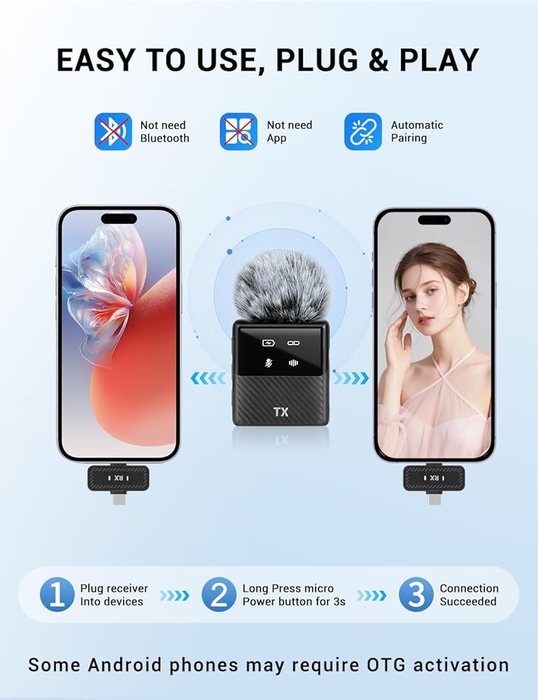 Plug and Play, Auto Connection: No app or Bluetooth required for automatic pairing. Simply plug the receiver into your device and turn on the lavalier microphone, they will connect instantly, saving you time on setup. You can connect two wireless lavalier microphones at the same time.