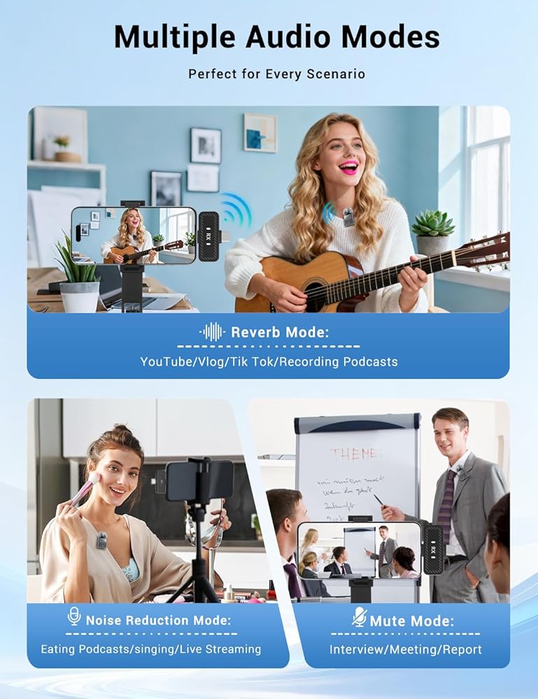 Intelligent Modes with One-Click Control: Single click for noise reduction mode (default), double click for mute mode, triple click for reverb mode. No need to restart the device— One-Click switch between modes effortlessly to meet different recording needs. From professional interviews to creative vlogs, this lav mic adapts to your scenario, letting you enjoy the fun of content creation to the fullest.