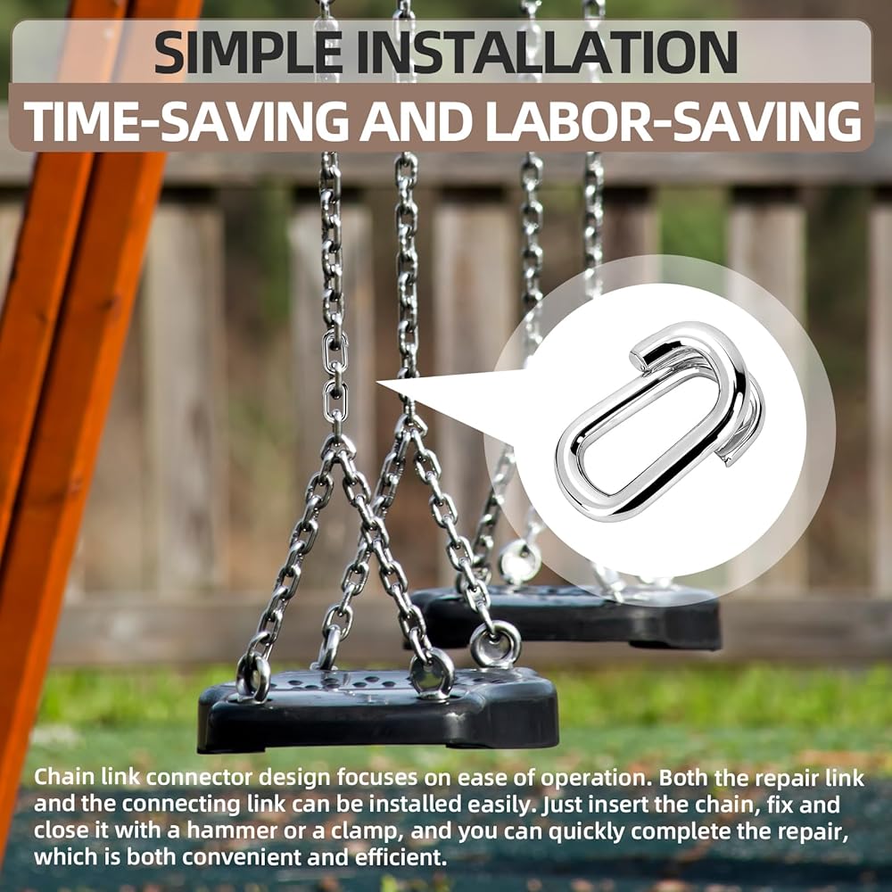 Chain repair lap link is made of galvanized metal, featuring a sturdy and wear-resistant structure. Its size is designed as a universal 1/4 inch x 1-1/4 inch, allowing for easy connection to chains or attachment of accessories. The design emphasizes ease of use, requiring only the insertion of the chain and the use of tools for fixation to complete the installation. It is applicable to various indoor and outdoor scenarios for tasks such as repairing swings, reinforcing fences, or hanging lamps, making it a practical and multi-functional maintenance solution.