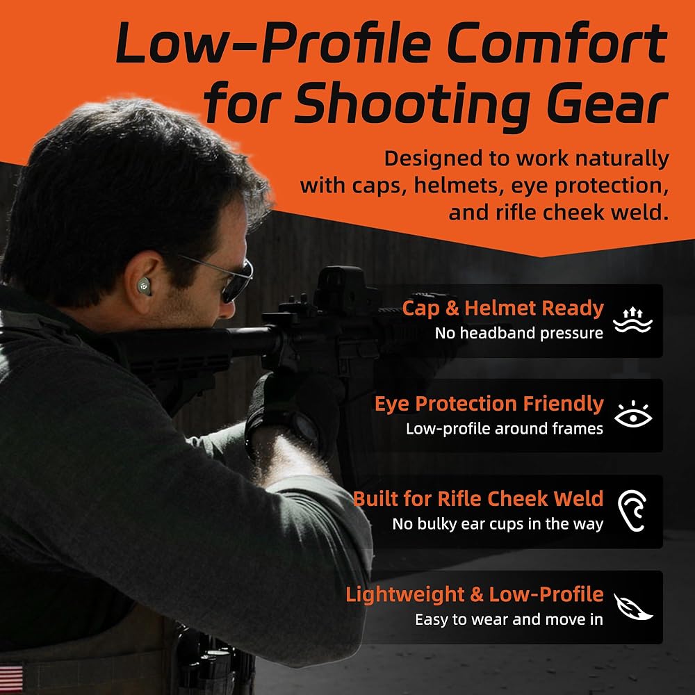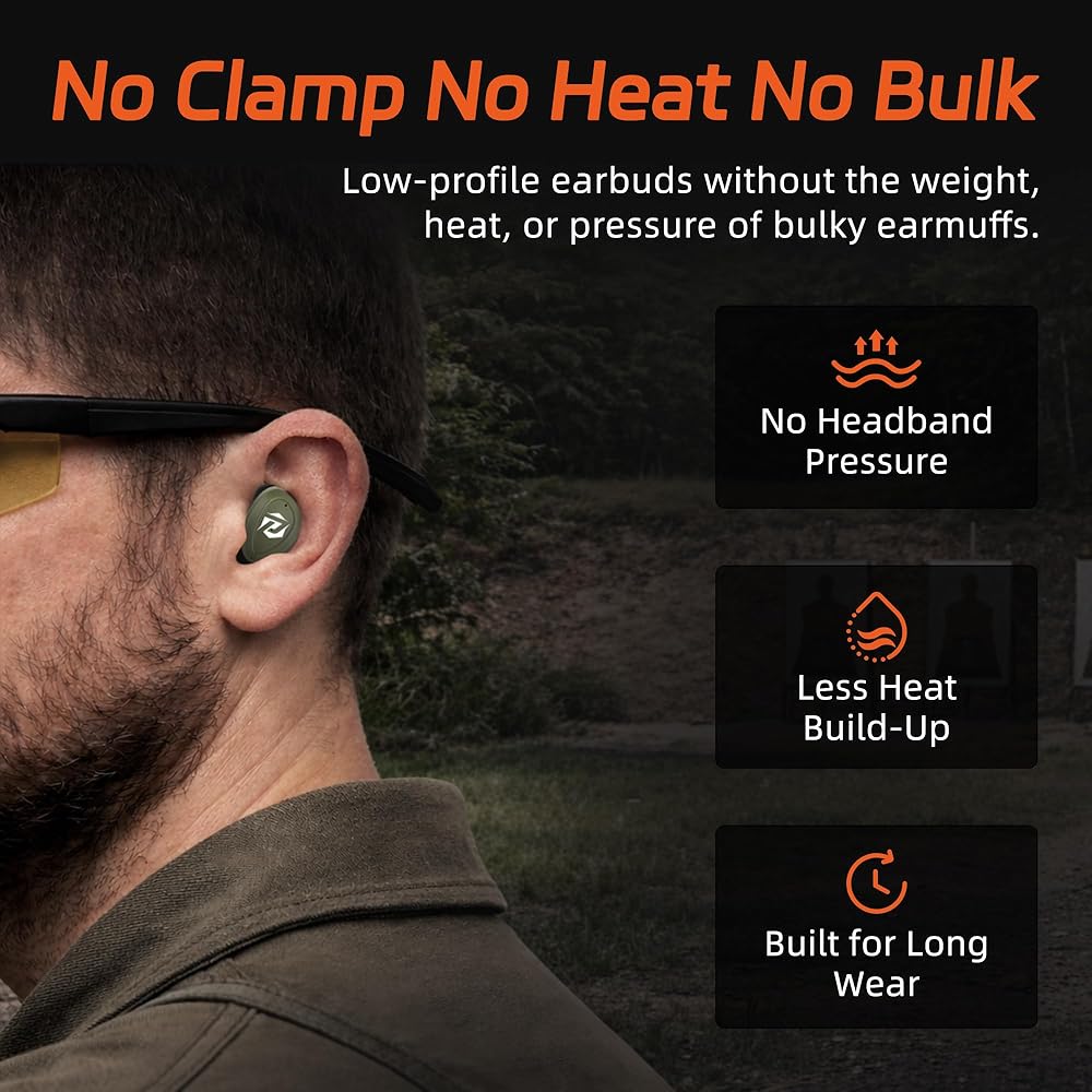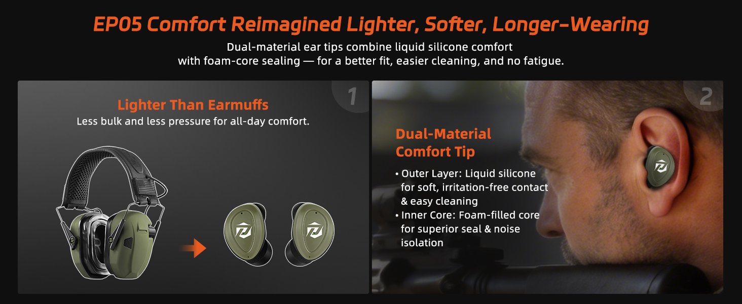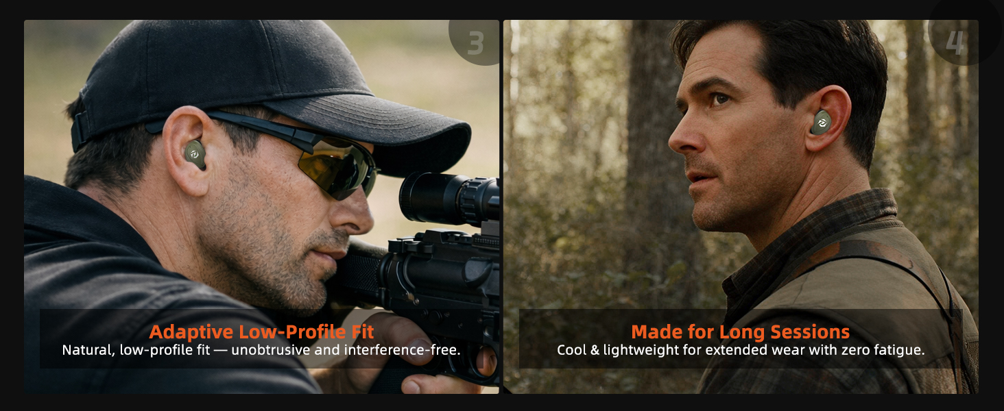 【All-Day Comfort for Extended Wear】The ergonomic earbud design and dual-material ear tips reduce pressure inside the ear canal, providing a secure and comfortable fit. Ideal for long shooting sessions, hunting trips, or outdoor training without the fatigue often caused by traditional earplugs.