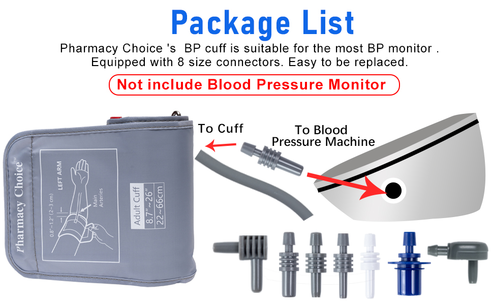 Package Including: Large blood pressure cuff with one 5mm connector. And extra 4mm connector, 4.6mm connector, 5mm connector (2 types), 6mm connector, 7mm connector, 11.5mm connector, quick guide manual ( Not include a blood pressure monitor)