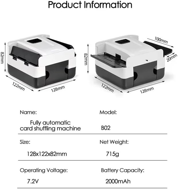 Specification: Name: Automatic Card Shuffler Material: ABS Battery Capacity: 2000mAh Operating Voltage: 7.2V Card Slot Capacity: 1-2 decks of playing cards Dimensions: 12.8cm x 12.2cm x 8.2cm Colors: Black/White Packing included: 1 * Automatic Card Shuffler (NO dealing function) 1 * Charging Cable
