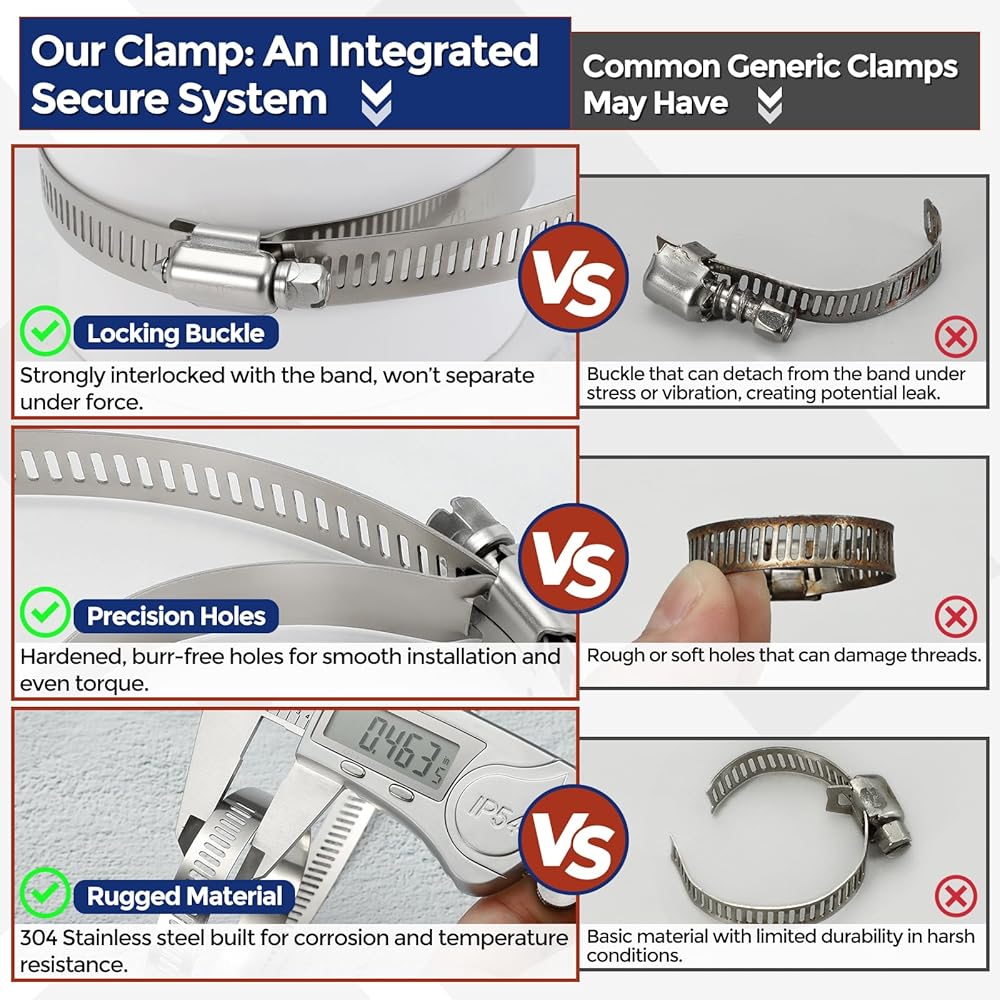 Easy Installation with Standard Tools: Engineered to deliver a secure seal on both small and large lines, our clamp's finely machined slotted holes and smooth band travel ensure consistent tightening without slipping. Designed for quick and straightforward installation, the clamp can be easily tightened or loosened using a standard screwdriver or wrench. The slotted screw head and smooth band edges ensure safe, hassle-free setup even in tight spaces.