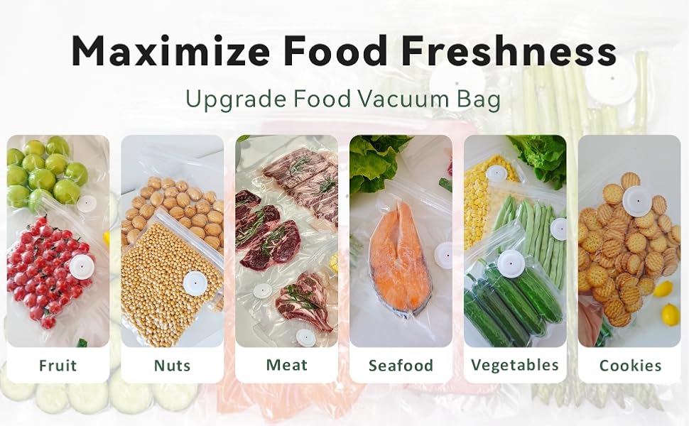 Multi-Purpose Storage for Longer Freshness: The embossed channel design improves suction efficiency, helping remove excess air to keep food fresh 3–5 times longer. Perfect for preserving vegetables, fruits, seafood, bulk meat, and dry goods, as well as organizing meal prep portions, snacks, and travel essentials.