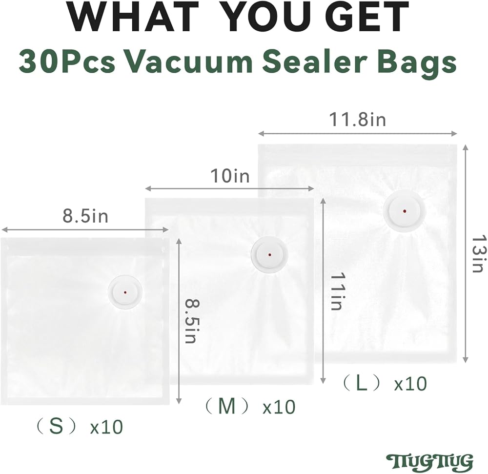 Compatible with Most Vacuum Sealers: This set includes 30 reusable vacuum sealer bags in three sizes: 8.5"×8.5", 11"×10", and 13"×10.8". The bags feature a standard valve caliber that works with most handheld vacuum pumps as well as traditional countertop vacuum sealer machines, ensuring broad compatibility and easy operation.