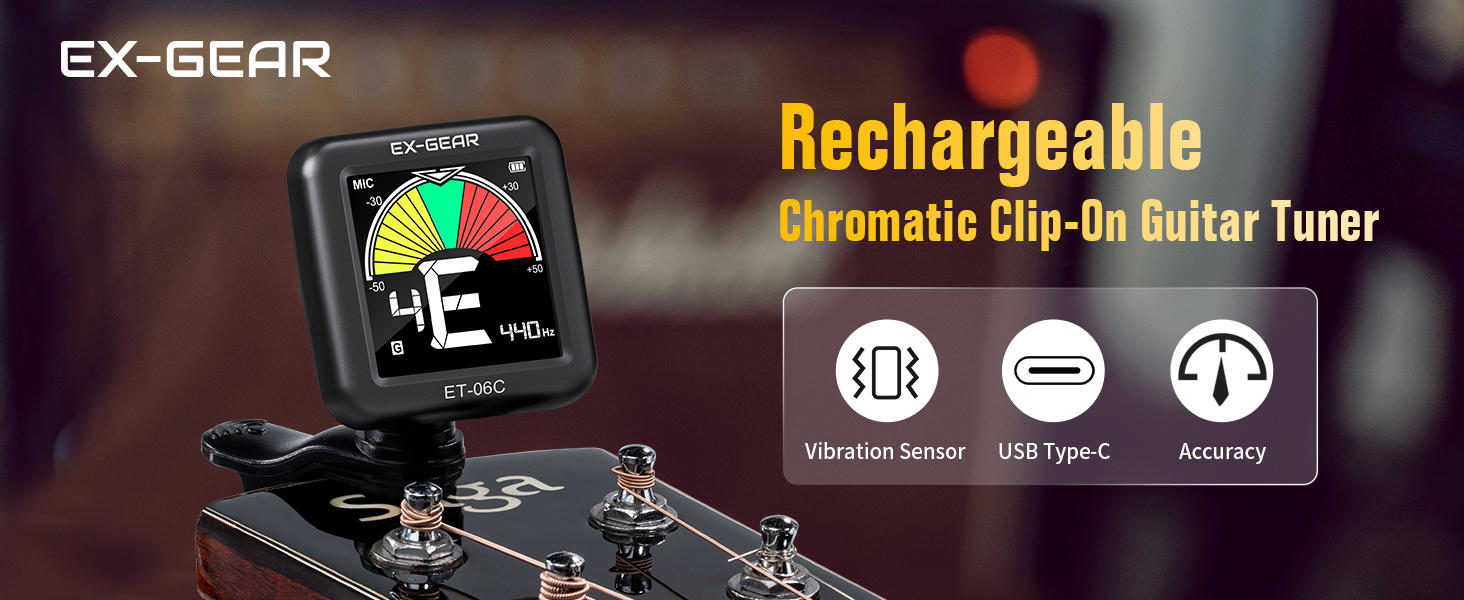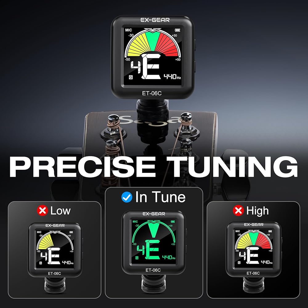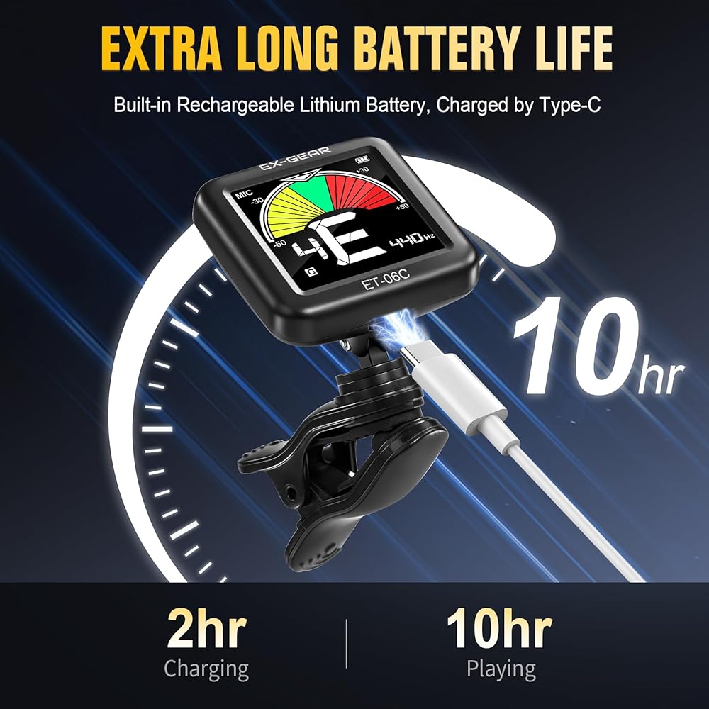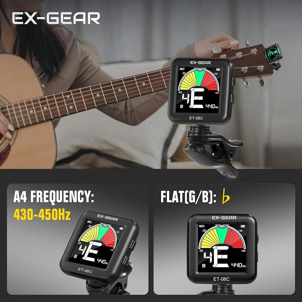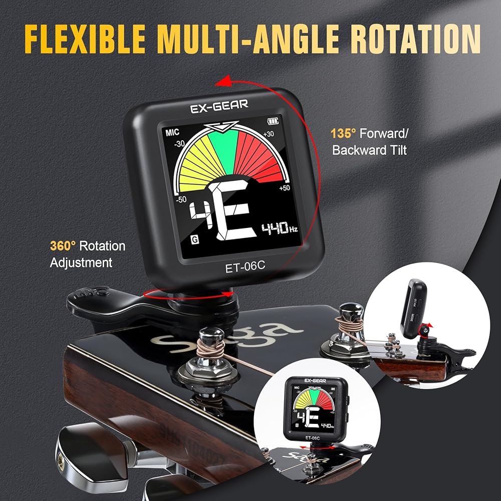EX-GEAR Professional Guitar Tuner Clip On, Quick & Accurate Tuning with Large LCD Screen, 360° Rotatable Rechargeable Acoustic Guitar Electric Guitar Bass Ukulele & Chromatic Tuner
