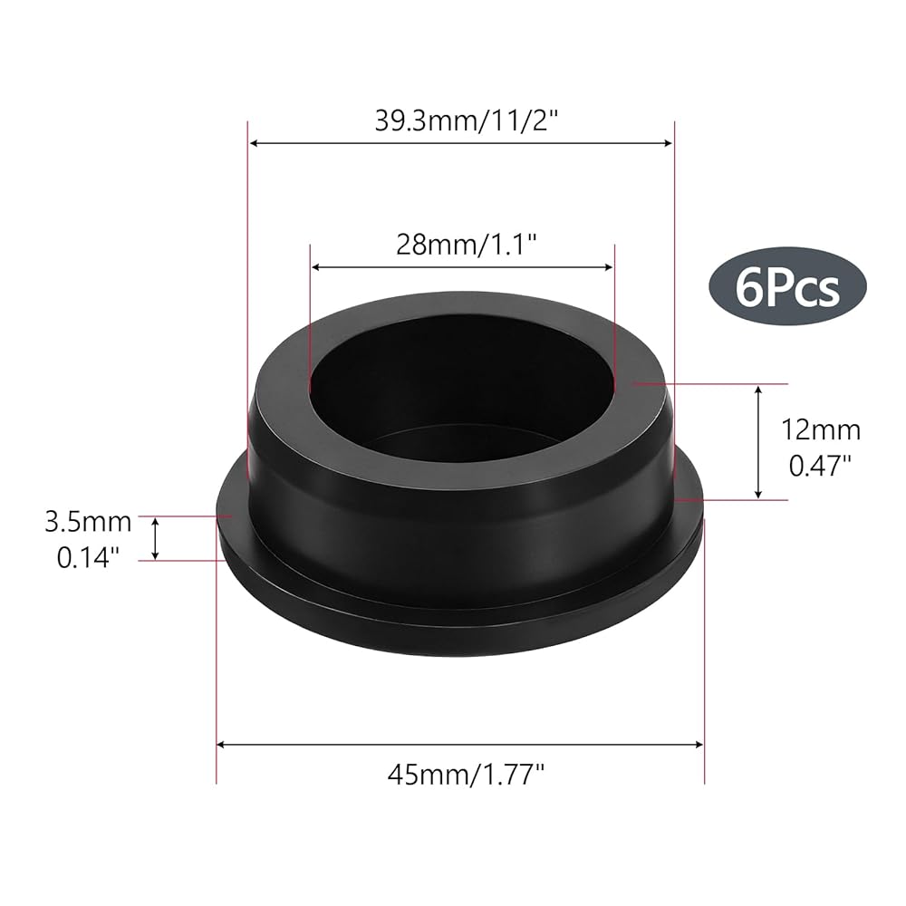PACKAGE & SIZE:6 pcs T-shaped silicone plugs; Outer (mount) diameter 39.3 mm (1 1/2"), inner diameter 28 mm (1.1"), head diameter 45 mm (1.77"), head height 12 mm, head width 3.5 mm. (Manual measurement ±1–2 mm.)
