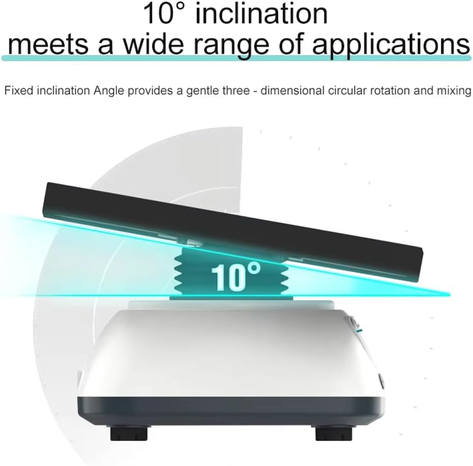 [10° Inclination]: The laboratory 3D rotary mixer has a 3D tray vibration oscillator with a 10° tilt angle, which provides gentle three-dimensional circular rotary mixing at a fixed tilt angle, providing accurate results for your experiments