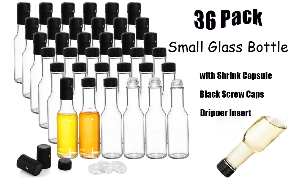 Include 36 pack small glass bottle, 36 airtight black screw caps, 36 snap on dripper insert and 36 shrink capsule designed with gold tear tab to help open them easily once they've been sealed to the bottle.