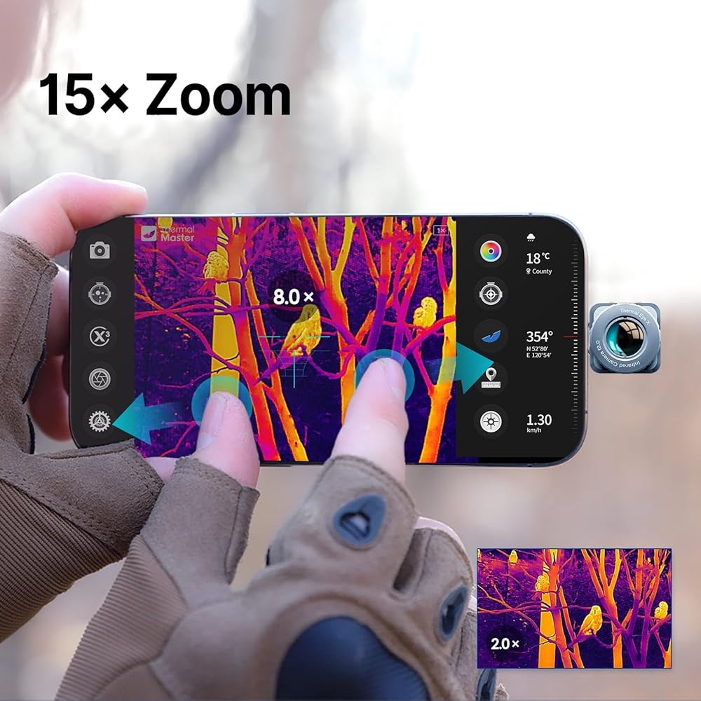 【15x Zoom】The 1–15× digital zoom allows effortless on-screen swiping to zoom in or out, enabling clear observation of distant heat sources and objects.