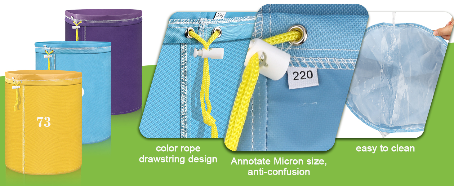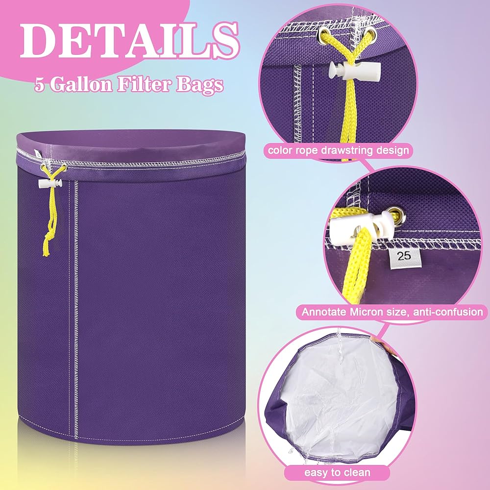Adjustable Drawstring Closure: The pull-string opening design of the 5-gallon mesh filter bags ensures a secure fit, people just pull the cords to tighten or loosen it however they need. It stays sealed tight during filtering so nothing leaks out, giving you worry-free use.