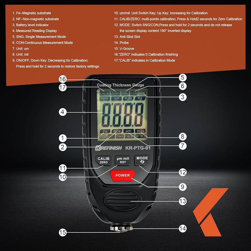 Automatic Fe/ NFe Detection: The instrument adopts the principles of electromagnetic induction (F probe) and eddy current effect (N probe) to automatically detect the properties of the substrate. Features iron powder filler recognition and iron-zinc coated substrate identification. A reliable thickness gauge for professionals needing a metal gauge thickness tool.