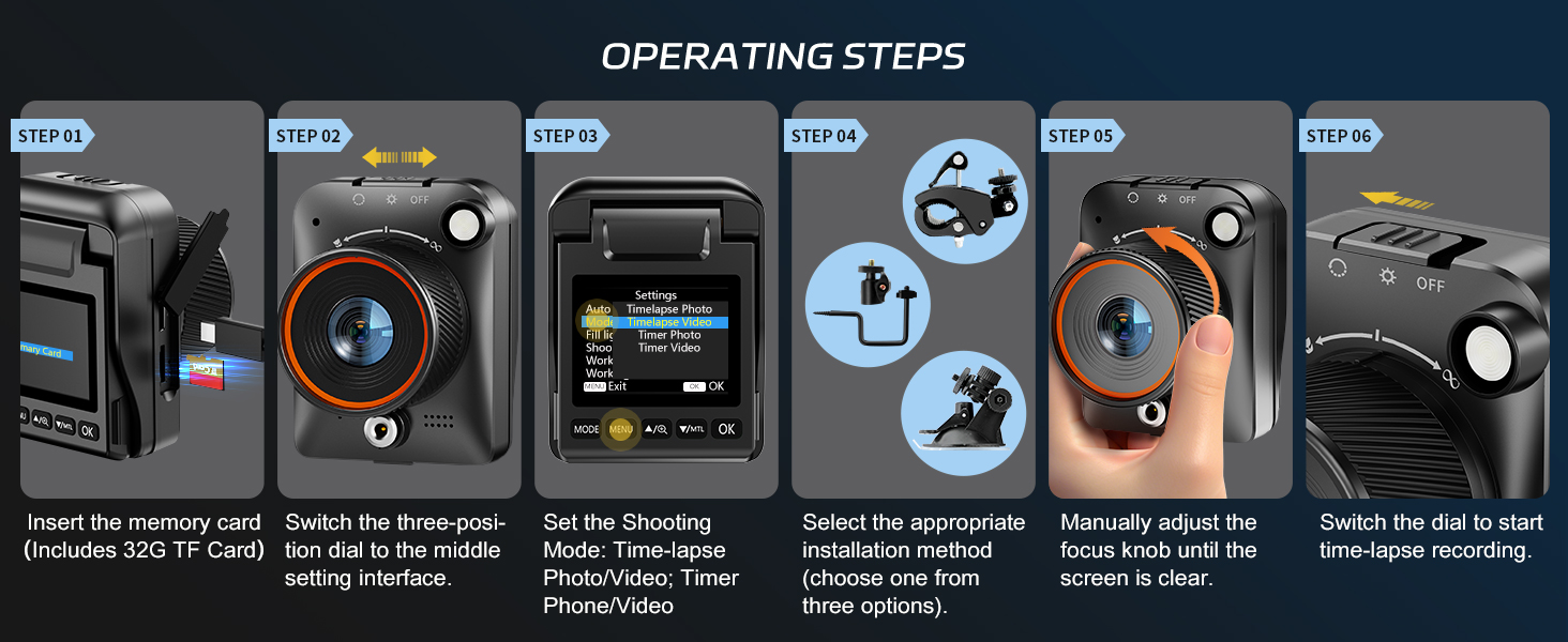 【Simple Three-Step Time-Lapse Photography Setup: Turn off with the three-position toggle switch — Settings — Start Time-Lapse. Experience quick and easy setup. Insert a memory card, and the time-lapse camera will continuously record in a loop, providing a seamless solution for long-duration time-lapse photography.