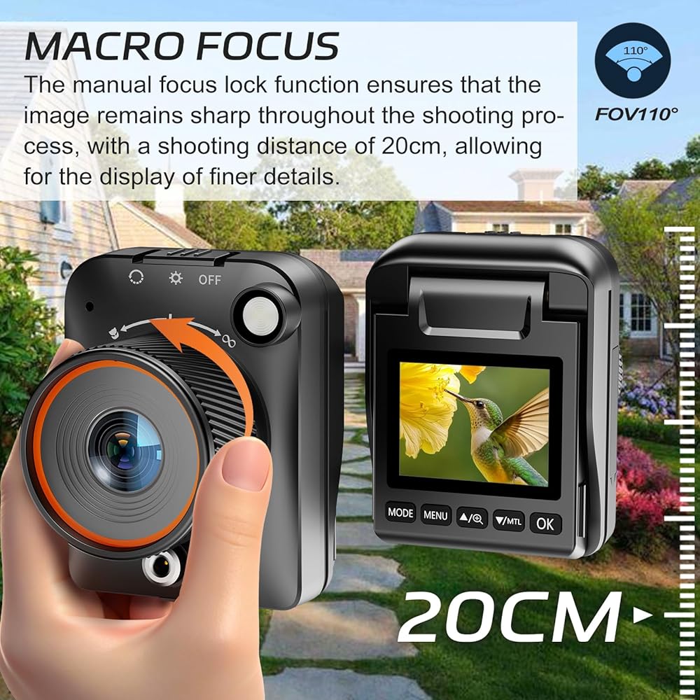 【Macro Focus and Wide-Angle Shooting】Time-Lapse Photography. The camera's manual focus function allows you to capture stunning macro photos from as close as 7.8 inches (20 cm). A 110° ultra-wide-angle view expands your field of vision, allowing you to capture expansive scenes with a time-lapse camera, faithfully capturing every moment. Furthermore, the 2.0-inch TFT 320x240 HD display can be tilted 90 degrees to provide clear preset images.