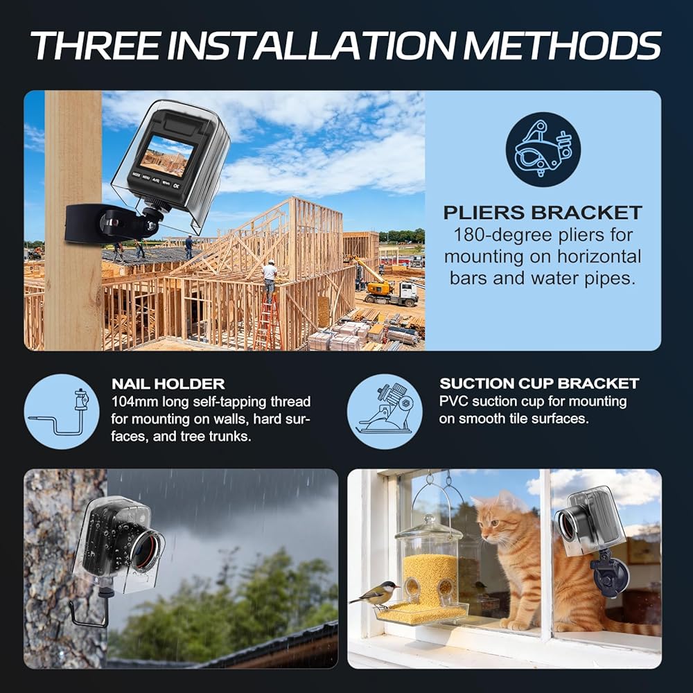 【Three mounting methods】Suitable for different scenarios: The suction cup bracket is suitable for indoor courtyard tiles, the self-tapping screws are suitable for tree trunks and rock crevices, and the claw clips are suitable for mounting on pillars and iron poles. Combined with a windproof and rainproof housing, it is designed specifically for harsh outdoor shooting environments.