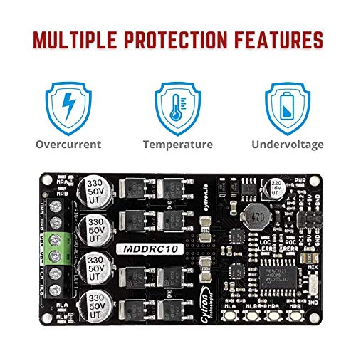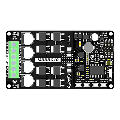 Building a RC vehicle or mobile robot without any microcontroller? MDDRC10 is what you need. It's plug and play and can be connected directly to the RC receiver. No coding or programming is needed. Selectable mixed mode allow the differential drive motors to be controlled from a throttle (forward-reverse) and a steering channel. Onboard switching regulator which produces 5V output is also available to power the RC receiver. This eliminates the need of extra battery eliminator circuit (BEC).