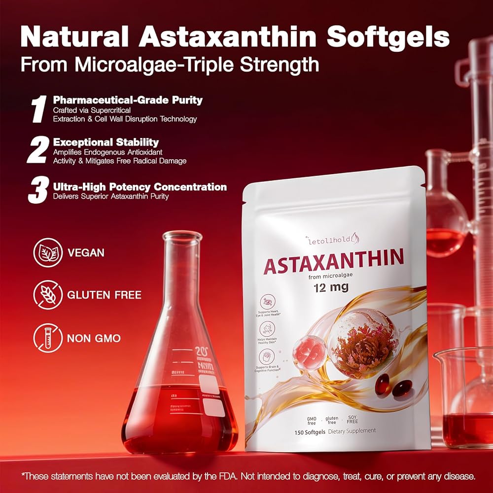 【Astaxanthin 12mg Softgels】Support your daily wellness with our 12mg Astaxanthin Softgels, made with pure, sustainably sourced Haematococcus Pluvialis microalgae—a natural antioxidant