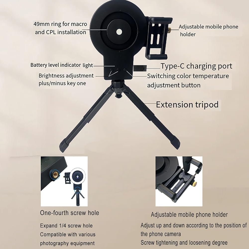 1.You can adjust the colour temperature (colour temperature: 2500K-6000K) in warm and cold colour mode; Adjustable up and down according to the mobile phone lens, fixed by the screw to the tightness; 49mm CPL special snap ring.