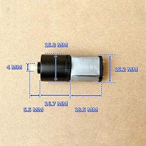 PGMTDEFXJOelectronic starter size: 15.2*18.5mmGearbox diameter: 15.8mmGearbox length: 16.7mmOutput Shaft diameter: 4mm Rated voltage: 6V Voltage range: DC 5-7.2VReduction ratio: 1:100Weight: 14g No-load speed: 72RPM@5V, 88RPM@6V, [email protected]: 59mA@5V, 65mA@6V, 83mA @7.2VThe test is powered on, the sound is very soft, the gearbox accuracy is very good. The torque is quite good, suitable for DIY micro-robot power, or climbing car and other car model power motors.Package included:electronic starter x1