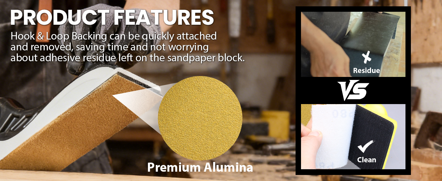 HOOK AND LOOP BACKING: The 25 yards sandpaper hook and loop (Velcro) backing securely attaches to hand sanding blocks, longboard sander or air file. It can be quickly attached and removed, saving time and not worrying about adhesive residue left on the sandpaper block