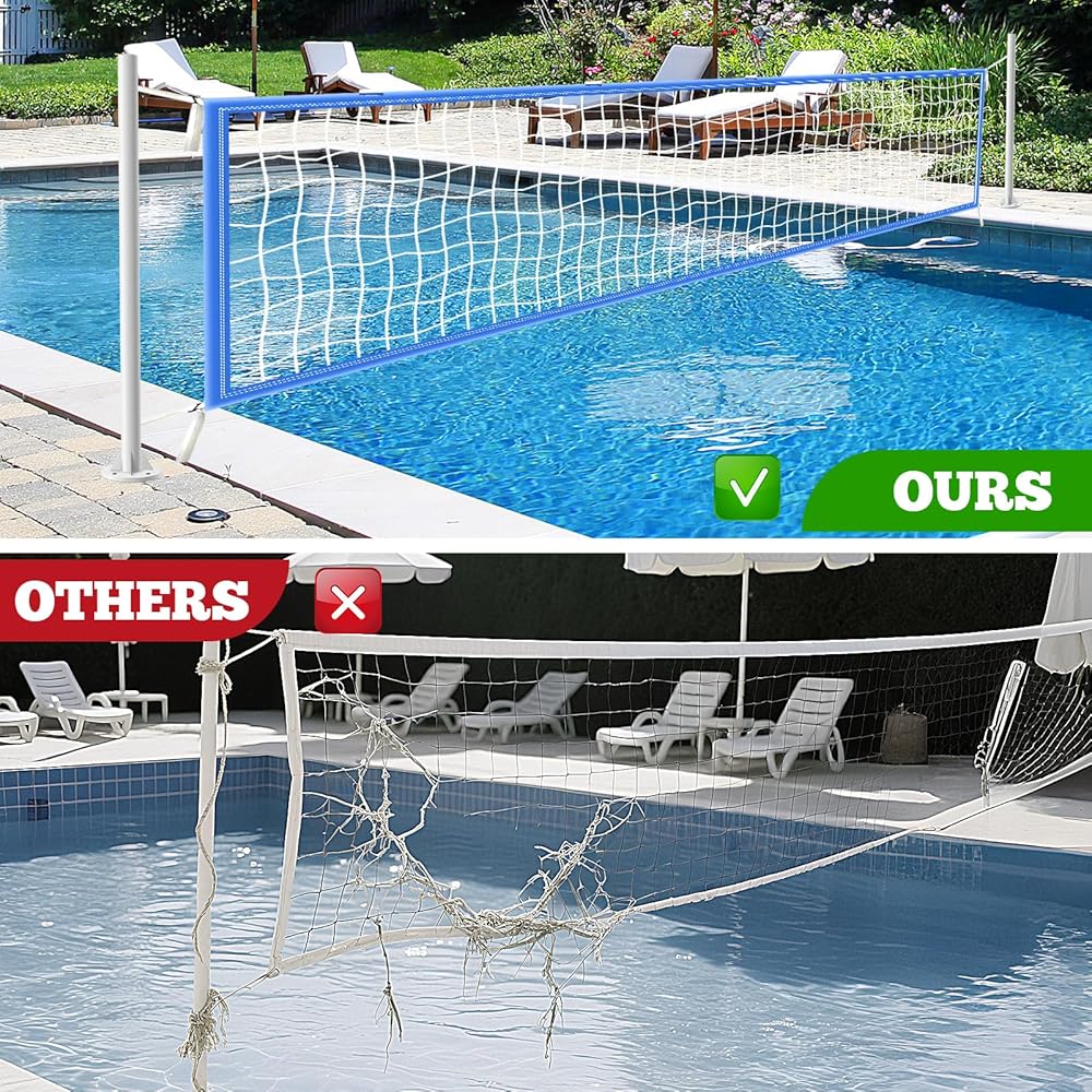Quality materials: Our pool volleyball net is made of tear-resistant PE material, offering exceptional durability and flexibility to easily withstand intense matches and various weather conditions. Whether it's scorching sun, downpour, and pulling, this volleyball net can maintain stability and durability, ensuring that you can experience a fun of water volleyball