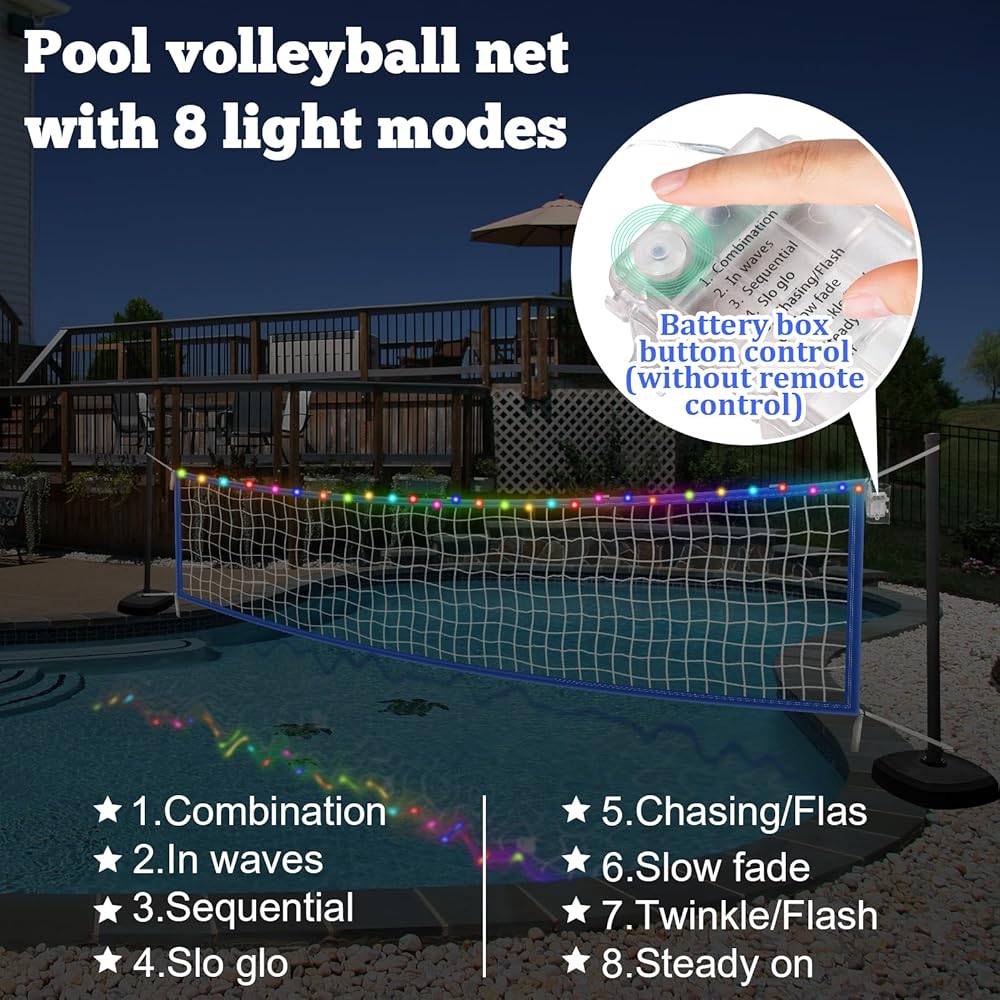 8 lighting modes: This LED pool volleyball net for inground pools features 8 lighting modes. Simply press battery box's button to alternate among different lighting effects, adding a diverse atmosphere and fun to your pool party or night competition. Whether it's romantic steady light or vibrant flashing mode, they can meet your different needs and make every games full of surprises