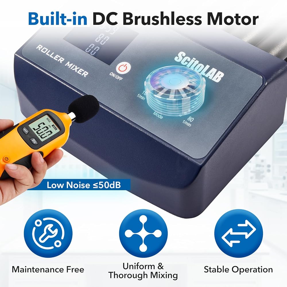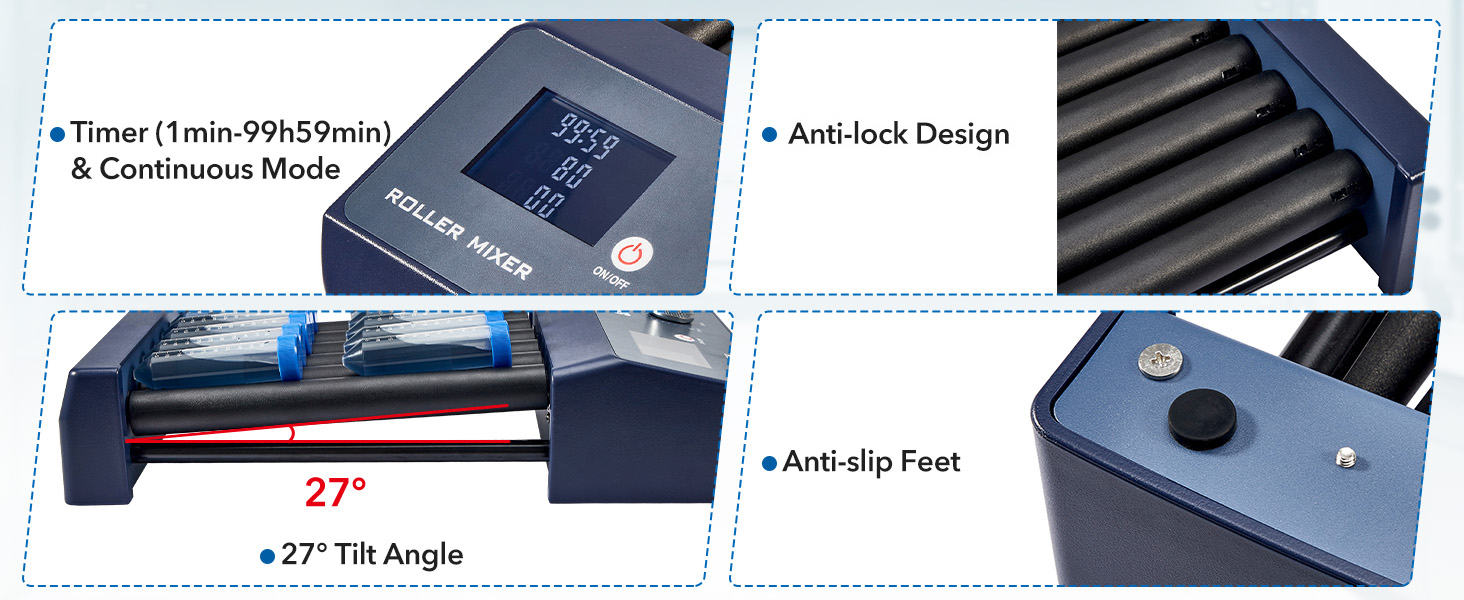 The rollers are made of high-hardness ABS material, non-slip and low noise. The smooth, gentle working speed of the instrument ensures uniform and thorough mixing of samples