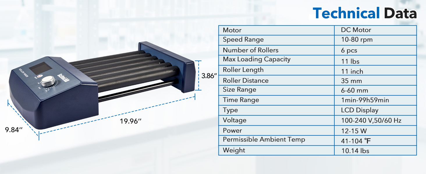Six rollers with 11inch roller length. Suitable for tubes 6-60mm in diameter, the roller mixer holds up to 11lbs. or 10 pcs 50mL tubes