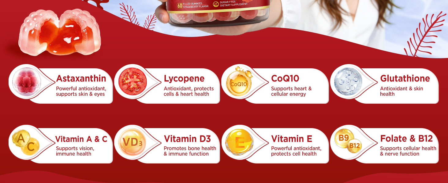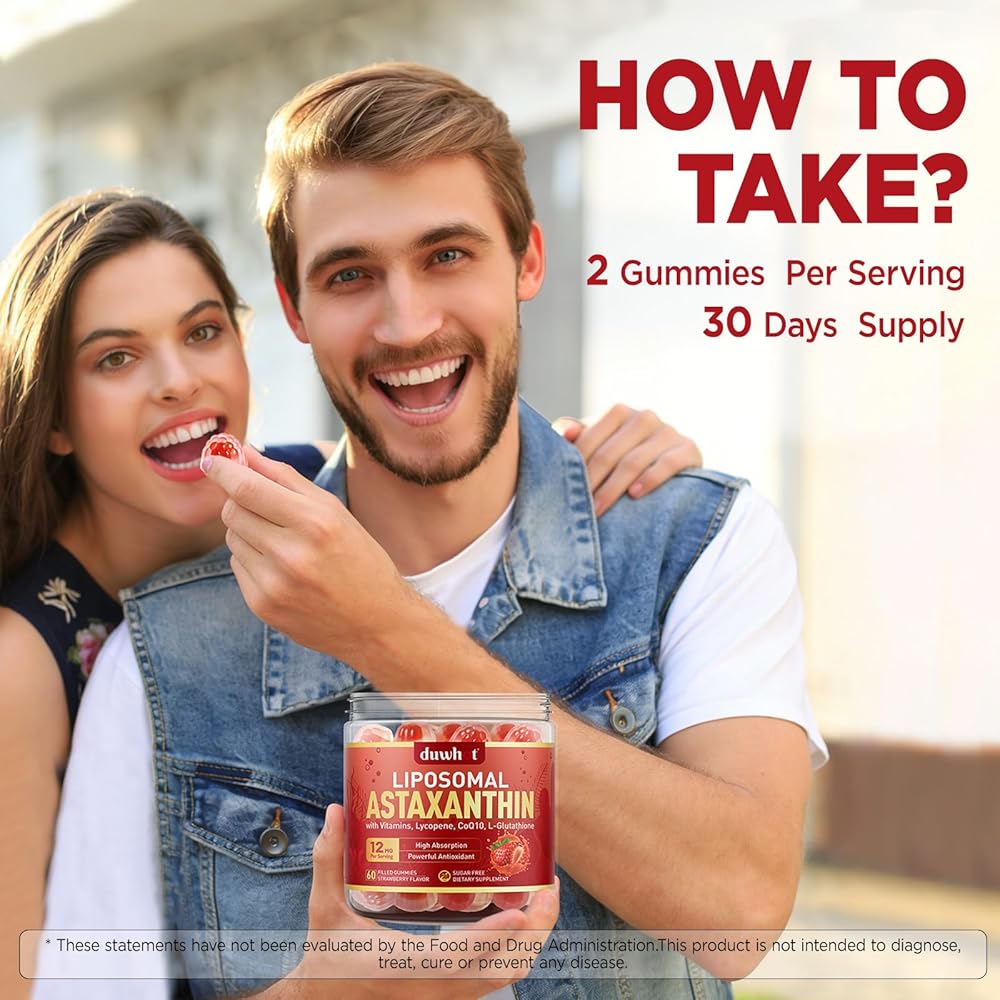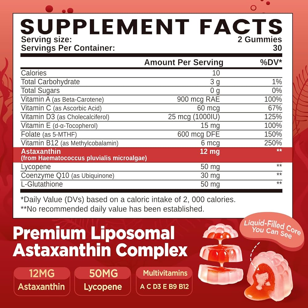 Advanced Liposomal Technology: Enhanced with liposomal technology and an innovative dual-layer (filled-center) gummy design for superior absorption and bioavailability, our astaxanthin supplements gummies ensure that key nutrients are efficiently delivered to your body, maximizing the benefits of every dose