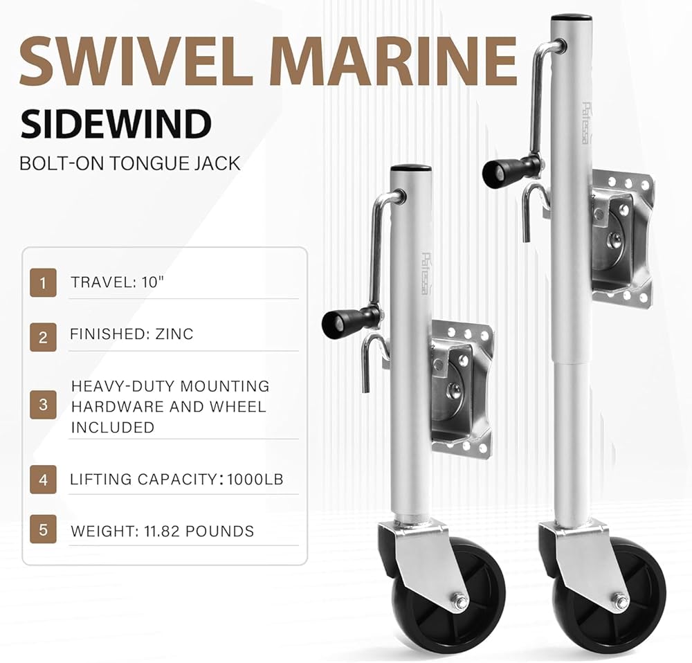 [Economical Replacement] Replacing your old swivel mount trailer jack is easy and economical with the Pafessa Sidewind Bolt-on Boat Trailer Jack. Pafessa sidewind jacks are the nica choice and value in the market.