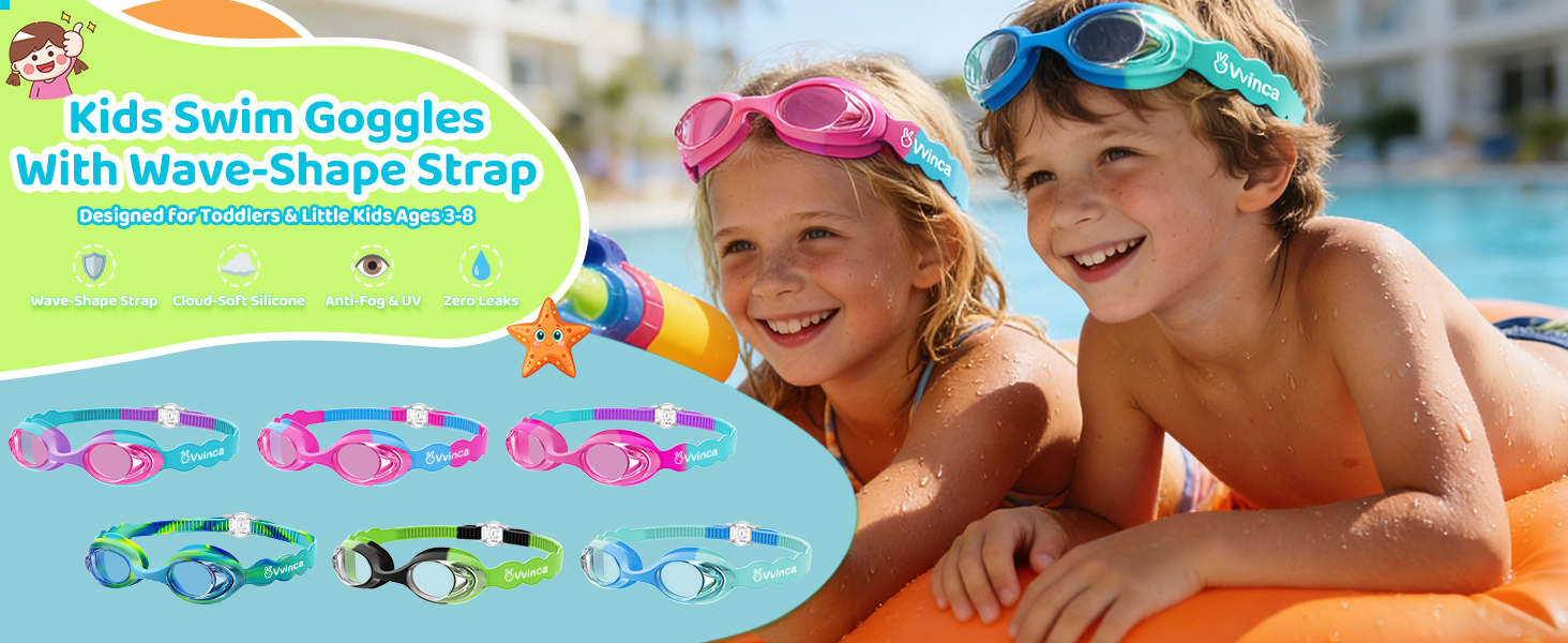 Exclusive "Wave-Shape" Comfort Strap: Vvinca designed this unique wavy silicone strap specifically for kids' sensitive heads. The spring-like curves disperse pressure and rest gently on the hair, creating a friction-free fit that prevents pulling or tangling. Finally, a pair of Swimming goggles kids will love to wear.