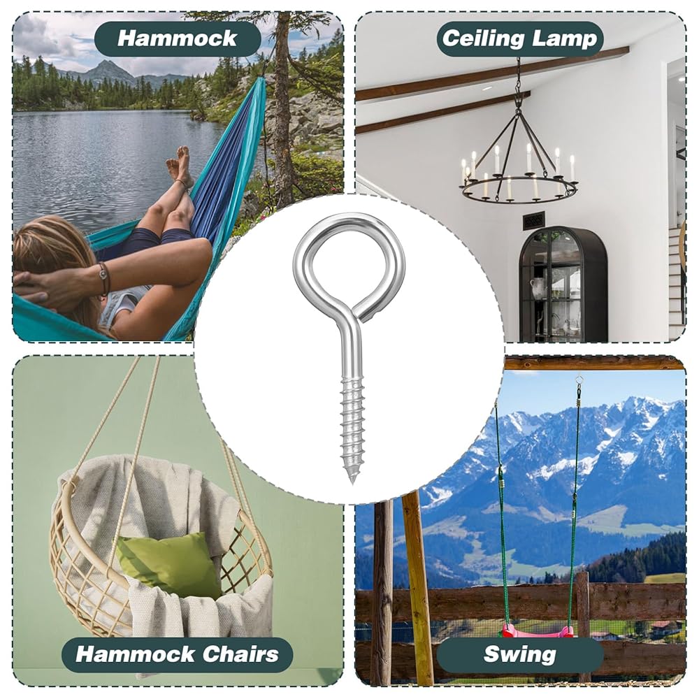 【Widely used】Eye bolt hooks eyelet screw are mainly used for wood securing, for cables wires, self-tapping, for tie-downs, lifting, for arts & crafts projects, for hammock stand, swings chair, yoga and so on. You can screw them into walls, woods, plywood, drywall and many different places to hang various items. Such as wall art,ring light, string lights, ladder hooks, hammock, jewelry holder, jewelry hanger, wire basket, etc.