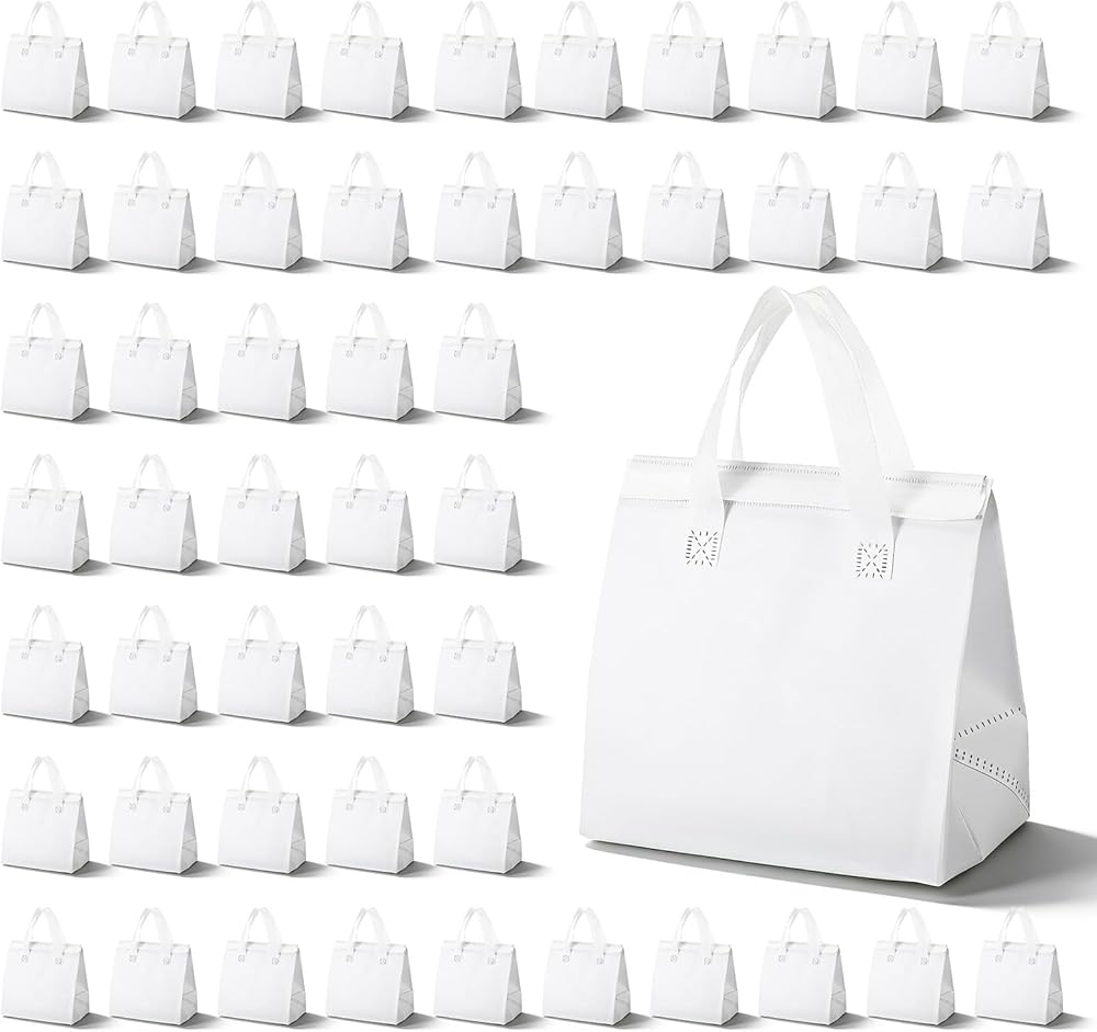 50PCS Insulated Take Away Bags Bulk, Thermal Insulated Lunch Take Out Grocery Hot Cold Food Bags, White Delivery Cooler Bag for Coffee Milk Catering Restaurant Grocery Picnic, 9.5" x 9.5" x 6"
