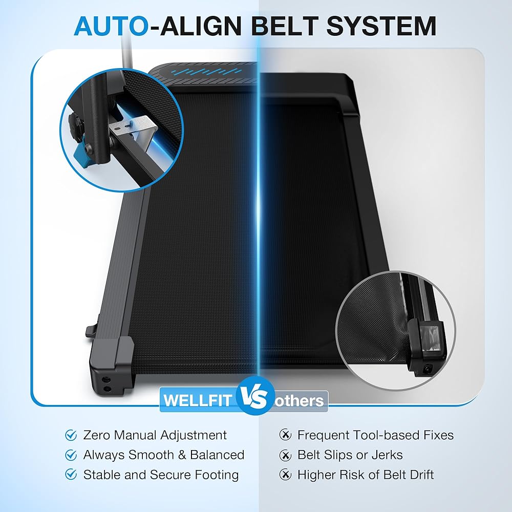 【Auto-Alignment Running Belt - No Tools, No Drift】WELLFIT treadmill automatically keeps the belt centered during use - no manual adjustments needed. Walk or jog with confidence, worry-free, and uninterrupted. Self-correcting belt for effortless running