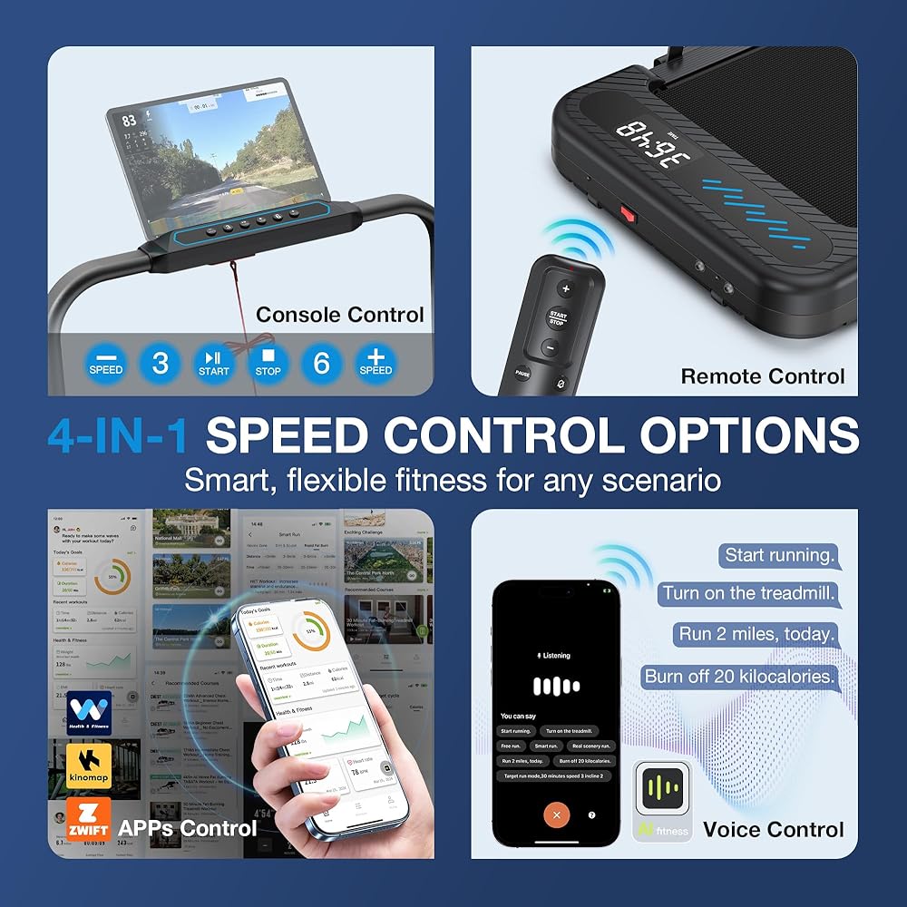 【4 Control Modes - No Bending, No Interruptions】Control the treadmill your way: handlebar buttons (Start/Stop, 3/6 MPH, Speed±), remote with mute, APP control, or APP voice control. The handlebar panel lets you adjust speed without leaning forward - safer and easier than traditional treadmills for home. Effortless control that keeps you in your flow