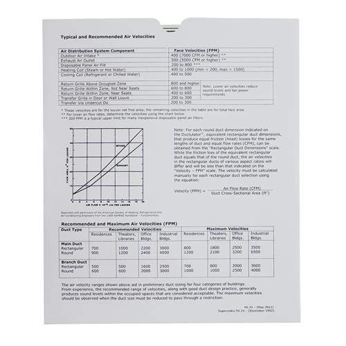 The Trane Ductulator is an accurate , easy-to-use calculating device that aids in laying out air-handling systems , sizing ducts and checking duct systems. Complete with both standard and metric calibrations. This hand-held rotating calculator is used for sizing supply and return duct systems using the equal friction design method. It includes scales for friction loss per unit length , air volume , air velocity , round duct diameter , and rectangular duct diameters. .