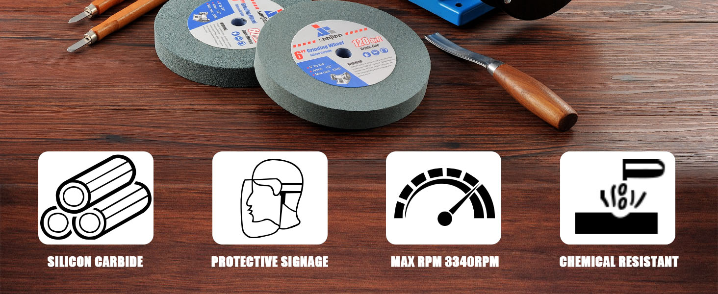 Fit to bench grinders: 6 inch diameter, 3/4 inch thickness, 1/2 inch arbor hole is compatible with most standard 6 inch bench grinders. MAX: 3340 R.P.M.