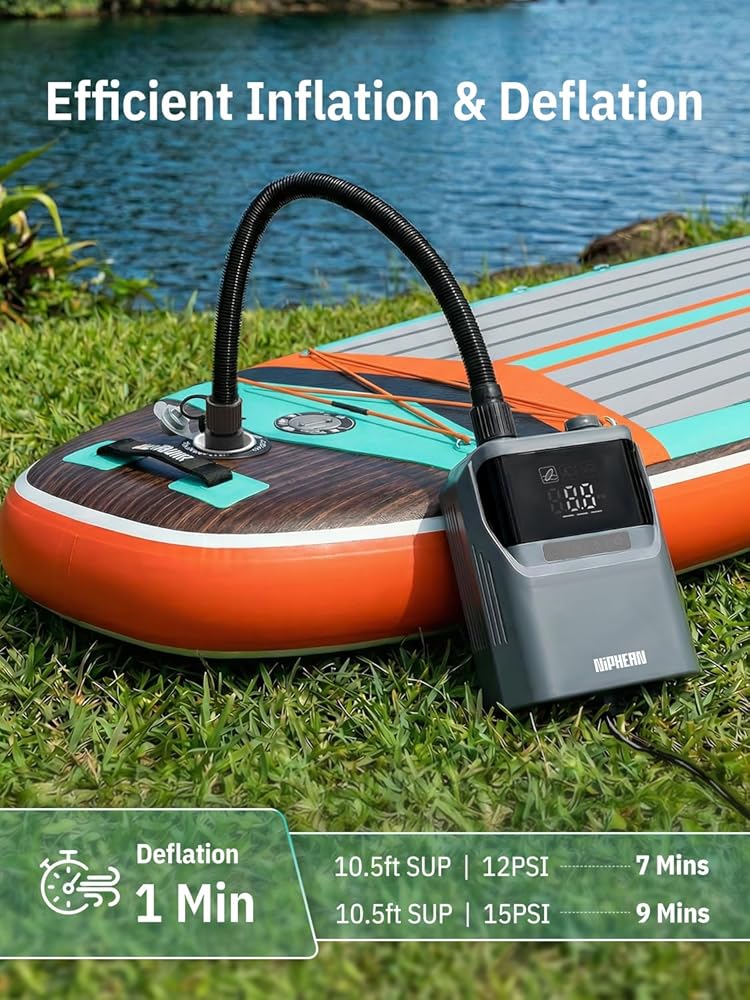 【Efficient Inflation & Deflation】Stop wasting time and energy with manual air pumps. Niphean electric paddle board pump powers up through your 12V car outlet to inflate a 10'6" paddleboard to 12 PSI in just 7 minutes(to 15PSI in just 9 minutes)—up to three times faster than doing it by hand. Meanwhile, Niphean SUP pump can achieve rapid deflation in just one minute. Whether you're heading out on the water or packing up camp, you'll spend less time pumping and more time enjoying your adventure.