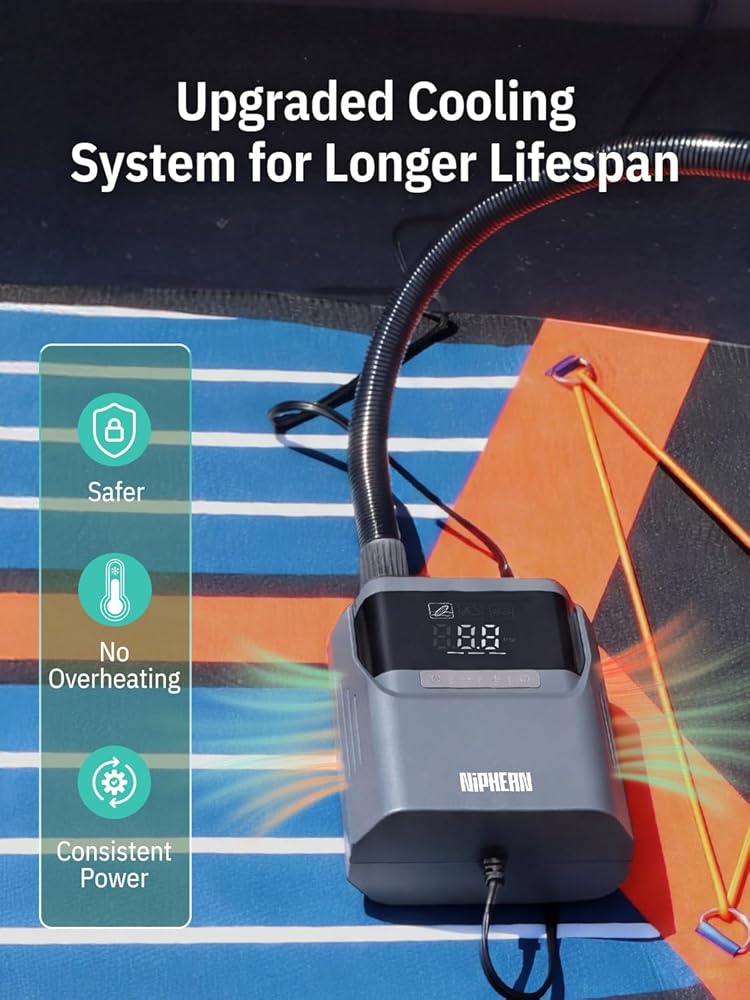 【Dual-Stage Pump & Truly Automatic, From Start to Finish】Set it and forget it. Niphean electric air pump handles the entire inflation process for you, starting with a high-speed 250L/min fill and automatically switching to 70L/min once pressure builds. When the pressure hits your target, SUP pump shuts off on its own—no constant checking, no risk of overinflation. Just reliable, hands-free convenience.