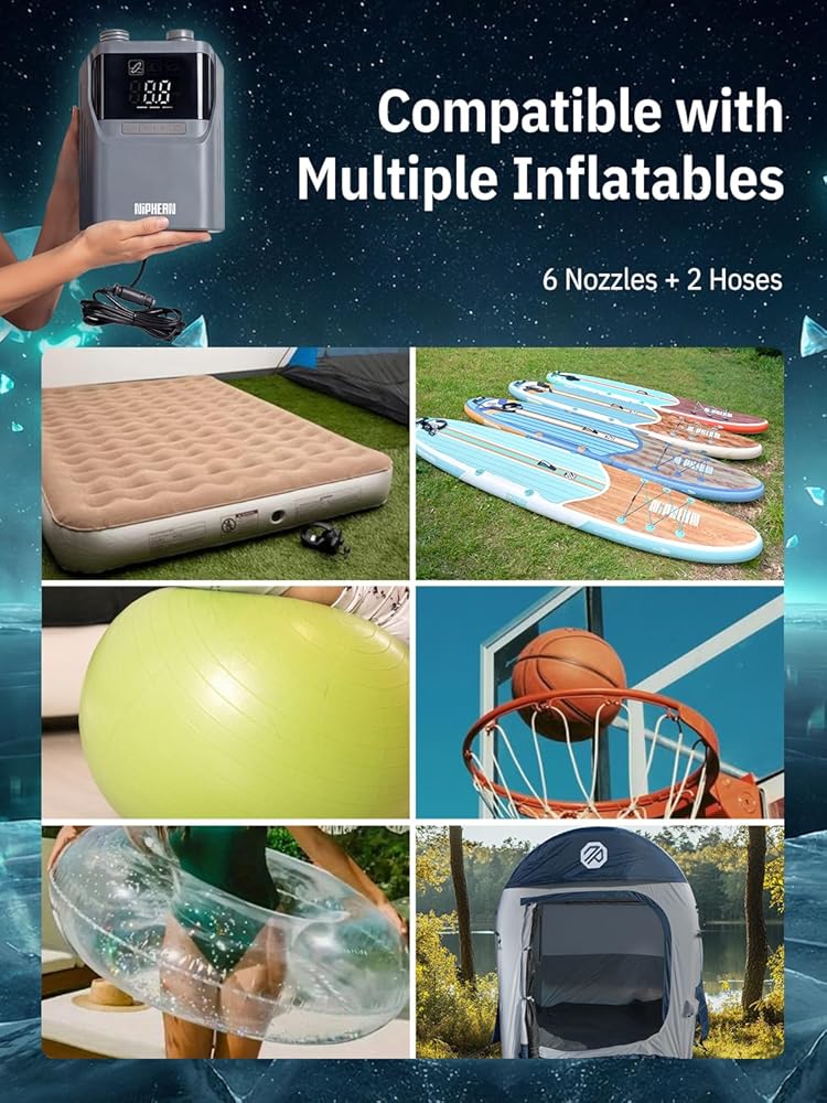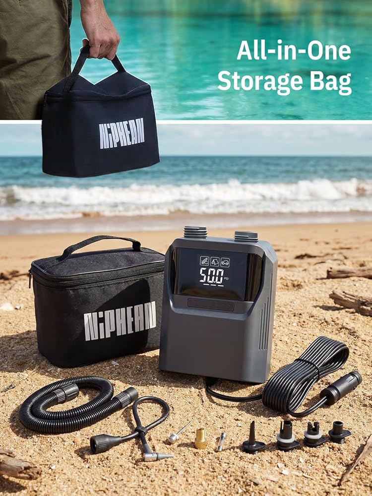 【Up to 50 PSI for Multiple Inflatables】With a powerful 50 PSI max - far beyond the standard 20 PSI - Niphean electric paddle board pump easily handles high-pressure needs like car tires. The 118" cord gives you plenty of reach around your vehicle, and the included six nozzles and two hoses let you inflate everything from SUPs and air mattresses to sports balls and camping gear. Keep one in your car and you're ready for anything.