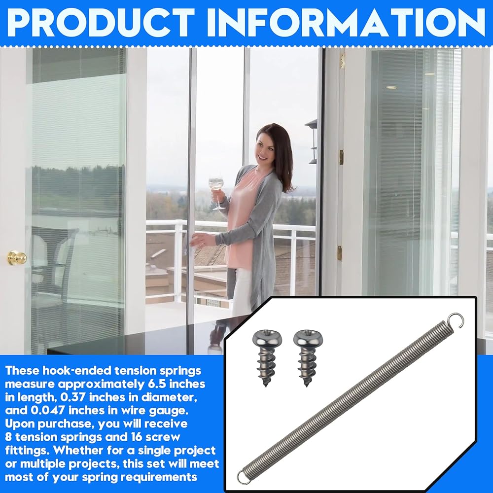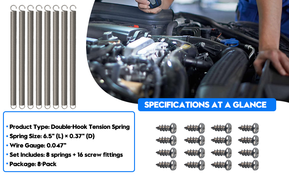 Product Information: These hook-ended tension springs measure approximately 6.5 inches in length, 0.37 inches in diameter, and 0.047 inches in wire gauge. Upon purchase, you will receive 8 tension springs and 16 screw fittings. Whether for a single project or multiple projects, this set will meet most of your spring requirements